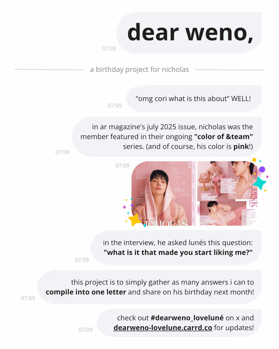 There are so many more things we would love to thank you for, but this letter would be a hundred pages long if we listed them all. If you would like to read through all the answers submitted and other silly things that came from this project, they’re compiled under the #dearweno_loveluné hashtag on X/Twitter and on Weverse! We hope these messages make you smile, can give you strength when you need it, and remind you that LUNÉ will always be here to support you.